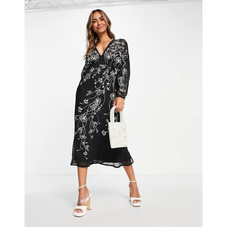 Asos Design Floral Embroidered Batwing Midi Dress In Black Asos